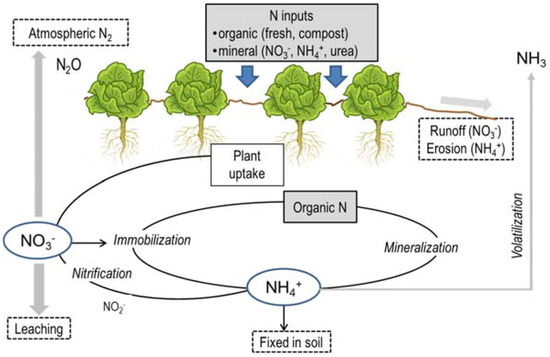 Vegetable crop residues often consist of a large amount of biomass with high N contents and C:N ratios ranging between 10 and 20, thus mineralizing rapidly even at low soil temperatures [4,65,66,67,68]. This means that when assessing the risk of post-harvest losses, the N content in the crop residues must be considered in addition to the potential for soil OM mineralization. Up to 198 kg·N·ha−1 may result from leaving broccoli crop residues in the field after harvest, representing a significant risk [69]. This situation may occur mainly for brassica crops, which are the ones with higher N contents (Table 1). Thus, it is very important to manage these residues to conserve N for the next crop [16].