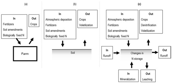 Nutrient budgets are commonly used to assess nutrient management by evaluating inputs and outputs over a period of time. First, there is a need for a survey to collect enough information to enable a thorough system analysis of the crop production practices [124]. The surveyed information is then used to perform the particular water and N budgets. The overall objective is to compare the total amount of water applied with the crop evapotranspiration and the total amount of N fertilizer applied with crop N uptake to identify and quantify possible N surplus and its origin. As the nutrient budget is significantly influenced by horticulture practices, the balances assessment provides an overview of current practices and allows the improvement of NUE. The nutrient budget can be calculated using simple tools as spreadsheets and user-friendly interfaces. A positive balance indicates a potential loss of nutrients to the environment or a nutrient accumulation in the soil, usually designated as surplus. A negative balance signifies soil nutrient depletion. Different budget levels can be considered in association with the system boundaries according to the available data and the purposes of the study (Figure 3). Farm gate balances, for example, demand minimal and routinely available data in farm records compared with soil surface or soil system balances. Thus, the budgets quantify water and nutrients that enter and leave the farm gate with no consideration of internal transfers or loss processes [63]. The key information to be collected in the horticultural farm consists of the area occupied by each crop, the amounts of N applied in fertilizers (mineral and organic) and soil amendments, the N fixation by the crops, the irrigation volumes and yields per crop.