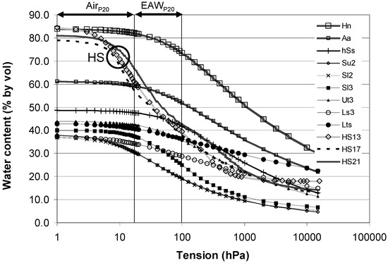 The water retention curves of all tested natural mineral and organic soils and three example horticultural substrates are illustrated in Figure 2. The easily plant-available water (EAW) in the tension range between 20 and 100 hPa and the air capacity (Air) are marked in the figure. All other required water and air capacities (for different kinds of cultivation) could be calculated based on these functions. As expected, due to the low dry bulk density, the saturated water content of the horticultural substrates was very high (Table 2). It varied between 71.8% (HS1) and 87.1% (HS6) by vol., averaged 82.4% by vol., and was comparable to the fen peat (Hn, 84.0% by vol.). However, the EAW and the air capacity demonstrated the special performance of horticultural substrates for horticultural applications. The tested horticultural substrates provided between 26.5 and 44.2 mm of water per 10 cm substrate depth (an average 30.8 mm). The natural mineral and organic soils could only store between 5.7 and 20.7 mm. However, what was more dramatic was the air capacity. The horticultural substrates provided an average 10.4 vol. % air with a major variation between the single samples (HS13: 2.7 vol. % and the peat-free HS6: 31.7% by vol.). Only about half of the tested substrates provided sufficient air (threshold value 10 vol. %, according to Raviv and Lieth [1]). The natural soils were even worse (0.6%–4.6% by vol., an average 2.0% by vol.) and were far from achieving the threshold value of 10%. The suitability for storing and transporting water and solutes is strongly influenced by shrinkage and rewetting properties [1,2]. The rewetting properties of most substrates were sufficient, with the exception of HS4, HS12 and HS14 which exceeded the threshold value for the WDPT of 5 s [19]. The shrinkage also showed great variability, ranging between 0.4 and 9.1 vol. % within the substrates. Only about half of the samples achieved or exceeded the threshold value for the capillary rise of 30 cm height for a 5 mm·day−1 rate. The same situation was observed for the mineral sandy (Ls3) and clayey loam (Lts) substrates.