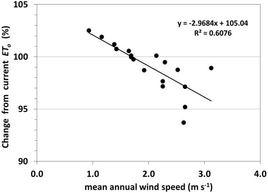 A plot of the change from current annual ETo (mm·y−1) assuming Tx increases by 2 °C, Tn increases by 4 °C, Td increases by 4 °C, and rc increases from 70 to 87 s·m−1 versus the mean annual wind speed. Figure 1 is from Snyder et al. [10].