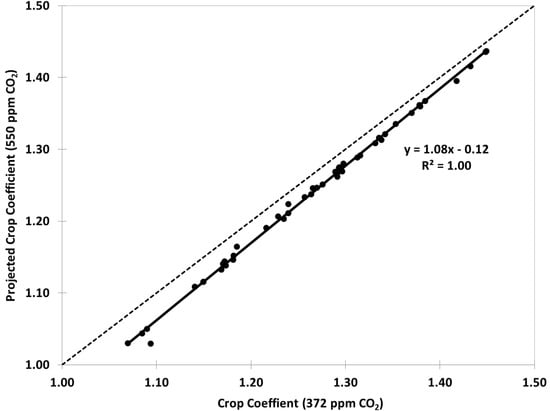 A plot of Kc values for alfalfa calculated from July 2003 mean daily weather data from 49 CIMIS weather stations in California for a climate with 550 ppm versus 372 ppm CO2. For the projected 550 ppm CO2 climate, the original daily maximum temperature data were increased by 2 °C, and the minimum and dew point temperatures were increased by 4 °C relative to July 2003 data. The wind speed and solar radiation were not changed from the original data. The alfalfa ETc was computed using the ETr equation (Equation (9)), and ETo was computed using Equation (4).