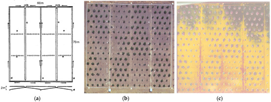 In one of the first examples of application of airborne imaging to crop farming, Alvino and Zerbi [82] set up an experimental field capable of creating a continuous gradient of water table level during the rainy season. Four inclined water tables were obtained (Figure 1). Figure 1b was taken in summer 1986 by an aircraft with conventional imaging equipment. Figure 1c is the conversion of the color photo to grayscale image, and then conversion to false colors. The upper part of the image (darker soil color) corresponds to the most drained part of the field during the winter season, which was then excluded from measurements. Results of the experiment are published by Alvino et al. [83], reporting the effect of shallow water tables on peach trees grafted on three peach seedlings.