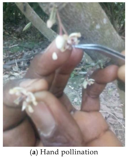 Flowers to be pollinated were identified the day before at 4.00 p.m. The criteria used were the flower size and the beginning of the separation of sepals (Figure 1a). The flowers were isolated with a piece of PVC tube (no more than two flowers per tube). The PVC tube was about 7 cm long and 2 to 2.5 cm in diameter (Figure 1b). The distal end was covered with a gauze fastened with an elastic band, and the base was fixed to the tree with a ring of modeling clay. The following morning (at about 6.30 a.m.), the tube was removed. The recently opened flowers were emasculated with a tip pincer by eliminating the staminodes to uncover the stigma. The pollen grains were manually removed from the flower and dropped on the stigma of an isolated flower on a same or a different tree for fertilization to avoid self-incompatibility and self-pollination. After pollination, the tube was quickly closed to prevent the entry of any pollinator. Care was taken to clean the tools and hands with diluted alcohol (70%) after every pollen transfer. The tube was removed three days after pollination. Pod formation of crosses is shown in Figure 1c.
