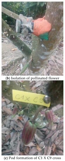 Flower pollination process (a) Hand pollination; (b) Isolation of pollinated flower (c) Pod formation of C1 X C9 cross.