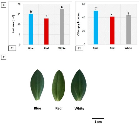 Effect of blue, red, and white LEDs on leaf traits of Eustoma. (A1), leaf length (cm); (A2), leaf width (cm); (A3), leaf thickness (mm); (A4), single leaf weight (g); (B1), leaf area (cm2); (B2), chlorophyll content; and (C), leaf morphology. Data are mean values (n = 10) and the vertical bars represent ± SE (Tukey’s HSD at P < 0.05).
