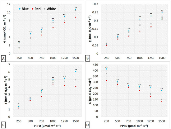 Effects of blue, red, and white LED light on leaf gas exchange at different photosynthetic photon flux densities (PPFD) in Eustoma leaves. (A), A (μmol CO2 m−2 s−1); (B), gs (mol H2O m−2 s−1); (C), E (mmol H2O m−2 s−1), and (D), Ci (μmol CO2 mol−1). Data represent means ± SE (n = 10); asterisks indicate a significant difference among the LED treatments at P < 0.01 (**) by Tukey’s HSD-test. The SE bar may not be seen on data points due their small values.