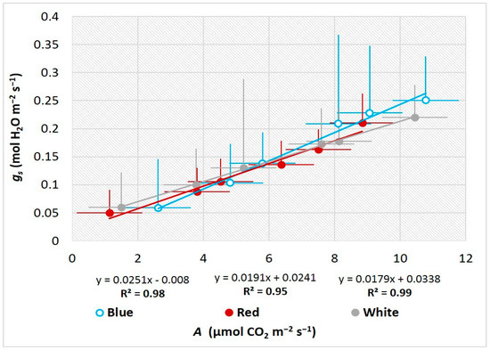 Figure 2 indicates that leaf A (Figure 2A), gs (Figure 2B), and E (Figure 2C) increased for each PPFD value from 250 μmol m−2 s−1 to 1500 μmol m−2 s−1, and that Ci decreased (Figure 2D). For the plants grown under the B LED light, Ci; A, gs, and E were greater at most PPFDs than the plants grown under the R and W LEDs (Figure 2A–C and Figure S1). In contrast, Ci differed significantly between the plants grown under the B, R, and W LEDs; the values were higher in the plants grown under the B LEDs than under the R LEDs at all PPFDs (Figure 2D). Therefore, B LED light at 1500 μmol m−2 s−1 PPFD resulted in increased photosynthetic function of leaves, with the greatest increase occurring for A, gs, and E compared with the values for the R and W LEDs. The correlation between A and gs (Figure 3) may be explained either by the effect of the B, R, and W LEDs or by the different PPFDs (Figure S1).