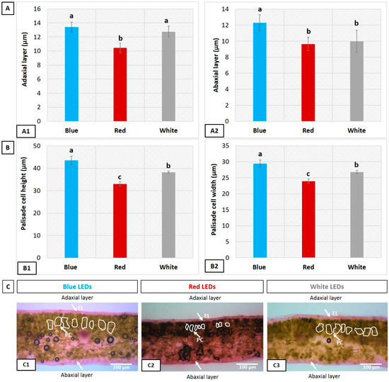 Significant differences were found in the adaxial and abaxial epidermal layers of the leaves grown under the B, R, and W LED treatments (Figure 4). There was no significant difference between the leaf adaxial epidermal layer under the B and W LEDs, but the adaxial layer was thicker under both than those under the R LEDs. (Figure 4(A1)). Likewise, the abaxial layer was thicker in the leaves grown under the B LEDs compared with those grown under the R and W LEDs (Figure 4(A2)); however, no significant difference was observed between the R and W LED treatments. Significant differences were also observed at the microscopic level in both the adaxial and abaxial epidermal layers (Figure 4C). A transverse section of the leaves showed increased palisade cell height and width in the B LED-treated leaves compared with those treated under the R and W LEDs and the difference was significant (Figure 4(B1,B2)). The cylindrical shape of the palisade cells increased under the B LEDs, whereas the cells remained almost spherical under the R LEDs (Figure 4(C1,C2)). A cylindrical cell shape was also found in the leaves treated under the W LEDs (Figure S1 and Figure 4(C3)).