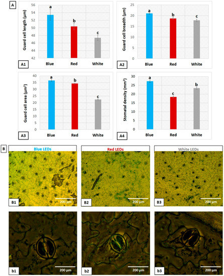 Microscopic analyses of leaf stomata indicated significant differences among the leaves grown under the B, R, and W LED treatments (Figure 5). The B LED-treated leaves showed well-organized guard cells with open stoma, and greater guard cell length, width, and area than the R and W LED-treated leaves (Figure 5(A1–A3,B1–B3); Figure S1). Stomatal density was higher for the leaves grown under the B LEDs followed by those under the W and R LEDs (Figure 5(A4,B1–B3)). The blue (B) LED light resulted in open stomata, which helps gas exchange.