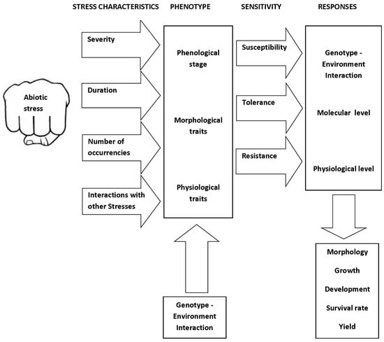 Crop yield and quality are the result of the interaction between a genotype’s potential expression and the environment, which is modified by agronomic management in order to meet the objectives of the farmer. Different genotypes have varying yield capabilities depending on their adaptation abilities []. Agricultural systems are continuously evolving due to innovation in agronomic tools and the identification of high-performance cultivars coming from traditional or biotechnological genetic improvements []. Abiotic stresses such as low water availability, high salinity, high or low temperatures, hypoxia/anoxia, and nutrient deficiency are among the major causes of crop failure. Plants are able to perceive environmental stimuli and adapt to different environments; however, the degree of tolerance and adaptability to abiotic stresses varies among species and varieties. Crops exposed to abiotic stresses respond by activating defense mechanisms. Therefore, crops in an early stage of stress do not show visible symptoms but their physiology can undergo significant changes []. The energy used to counteract or cope with abiotic stresses is called “fitness cost” and does not contribute to crop production. Crops have to balance the resource allocation between productivity and defense actions [].
