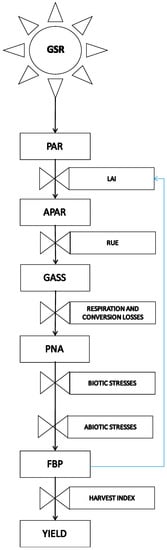 The general scheme proposed in Figure 1 describes the plant response to an abiotic stress with given features (duration, severity, etc.). The stress acts on a crop with given phenotypic characters to result in the final effects on growth, development, and mortality rate []. The basic scheme of Figure 1 is the result of a complex causal chain, which involves plant hormones and acts at the molecular and physiological level. The knowledge of this causal chain is substantially increasing thanks to transcriptomics, metabolomics, proteomics, and other integrated research approaches []. The conceptual scheme illustrated in Figure 2, widely adopted in crop yield simulation [,], shows crop production as the final result of a dry matter cascade triggered by solar radiation intercepted by plant canopies, which provides energy for the photosynthetic process.