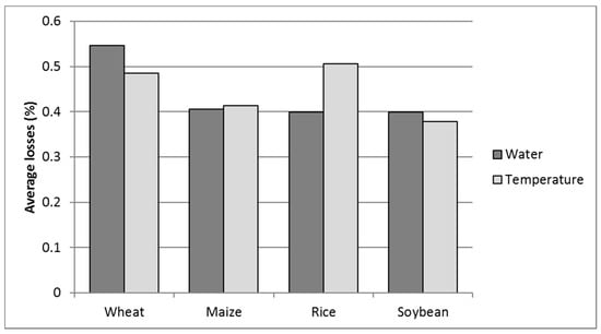 Mean global water and temperature stress losses for the four selected crops, wheat, maize, rice, and soybeans (WMRS) (% on potential net assimilation. PNA). Values above 1 of cumulative water and temperature stresses are the result of non-additive effects of multiple stresses [].