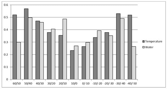 Mean latitudinal water and temperature stress for the four selected crops (WMRS). Values above 1 of cumulative water and temperature stresses are admissible due to the non-additive effects of multiple stresses [].