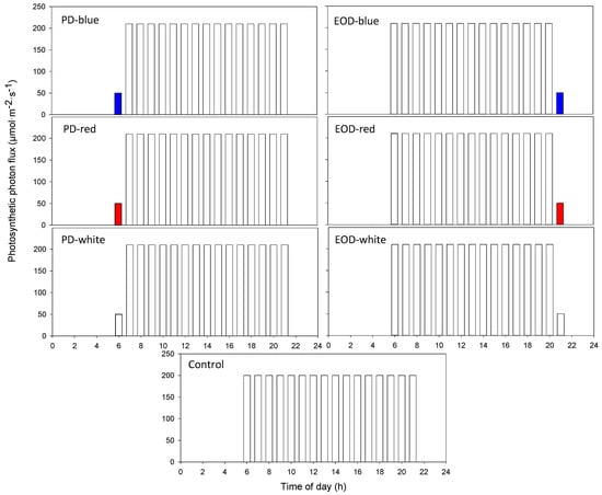 All treatments provided a DLI of 11.5 mol·m−2·day−1 over a 16-h photoperiod, measured with a spectroradiometer (SS-110; Apogee Instruments Inc., Logan, UT, USA) at mid-canopy height. Three PD (0600 to 0700) and three EOD (2100 to 2200) light-quality treatments were evaluated in the study, each providing 50 ± 2 µmol·m−2·s−1 of either blue, red, or broadband white light from LEDs (RAY66; Fluence Bioengineering, Austin, TX, USA). The main DLI was provided by white LEDs emitting 210 ± 2 µmol·m−2·s−1 from 0700 to 2200 or from 0600 to 2100 for the PD or EOD treatments, respectively. A control treatment was included which provided 200 ± 2 µmol·m−2·s−1 of white light from 0600 to 2200. An illustration of the treatments is shown in Figure 1. The blue and red LEDs had peak wavelengths of 446 or 664 nm, respectively; the broadband white LEDs had three main peaks: blue (446 nm), orange (599 nm) and red (664 nm).