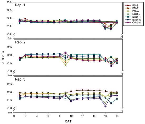 Average daily near-canopy air temperature (ADT) measured during each experimental replication. PD = pre-dawn; B = blue; R = red; W = white; EOD = end-of-day; DAT = day after transplanting.