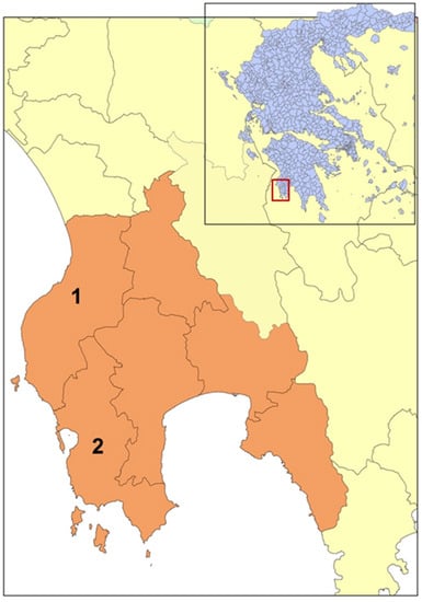 Messenia is a regional unit in the Peloponnese peninsula in south-west Greece and is considered to be one of the most important olive-growing regions in the country [24]. It has a population of 234,700 inhabitants and an area of 2991 km2 [25]. There are six municipalities in Messenia, including Pylos-Nestor and Trifylia, where the study was conducted (Figure 1). Olive farming is one of the most important occupations in Messenia, with 71% of the agricultural area and 20% of the total area in the region consisting of olive groves [26].