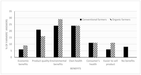 Benefits of organic farming as perceived (open-ended question) by organic (n = 16) and conventional (n = 23) olive farmers in in Messenia, Greece.