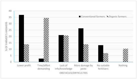 Conventional farmers perceived a low profit as the most critical difficulty with organic farming, which was not shared with the organic farmers (Figure 3). They were also worried about difficulties in controlling pests and finding suitable fertilizers that would be allowed in organic olive farming. This was of less concern among the organic farmers. However, organic farmers were somewhat less satisfied with their pesticides and fertilizers (6.6 and 7.2 out of 10 scores, respectively) compared to the conventional farmers (7.8 and 8.4 out of 10 scores, respectively). Both groups of farmers felt that there was a lack of information and knowledge about organic farming, which was seen as a barrier to adopting the system (Figure 3). The main concern among organic farmers was the high time demand, although there was no difference in the labor cost between organic and conventional olive farming (909 and 936 €/ha/year, respectively).