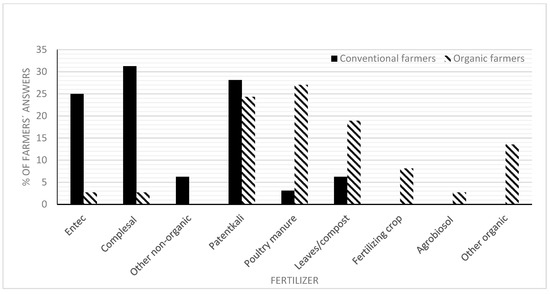 Organic and conventional farmers used different fertilizers, except for the organically approved, nitrogen- and phosphorus-free fertilizer Patentkali, which was used by both groups. Most of the conventional farmers used traditional synthetic fertilizers, while most of the organic farmers used manure, compost and other organic methods (Figure 4). In both groups, some farmers used more than one fertilizer.