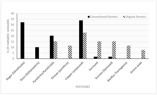 Many of the farmers, and especially conventional farmers, used several pesticides to combat different kinds of pests (Figure 5), while some 30% of the organic farmers used no pesticides at all. Conventional farmers were quite aware of the possible negative effects from pesticides and mentioned, for example, contamination of water and also that ‘good’ insects are killed by insecticides. One farmer mentioned that conventional agriculture has damaged the olive trees’ natural defense against pests, making them dependent on pesticides. The most commonly used insecticide by conventional farmers was Dimethoate. Organic farmers only used substances approved in organic farming. Spinosyn A and D (in Success) and Pyrethrins can be considered as naturally-derived chemical pesticides, whereas e.g., Bacillus thuringensis is a biological defense and kaolin (in Surround) only works as a physical protection. Copper compounds were commonly used by both organic and conventional farmers as fungicides. No herbicides against weeds were used by the organic farmers.