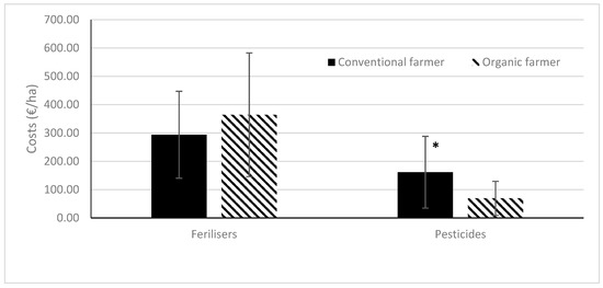 Annual cost of fertilizer and pesticides among organic (n = 16) and conventional (n = 23) olive farmers in Messenia, Greece. The error bars indicate standard deviations. The asterisk (*) marks statistically significant differences (<0.05) between the two groups of farmers.