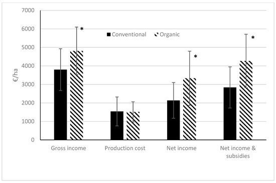 Annual income, costs and profits from olive oil production among organic (n = 16) and conventional (n = 23) olive farmers in Messenia, Greece. The error bars indicate the standard deviations. The asterisks (*) mark statistically significant differences (<0.05) between the two groups of farmers.
