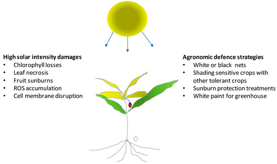 Effects of high light intensity on crops and agronomic strategies that can be adopted for increasing or avoiding crop or produce damage.
