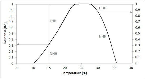 A more physiologically-based way to simulate thermal resources, taking into account the effect of sub-optimal or supra-optimal temperatures, is provided by the NHH method that converts hourly average temperatures to a normal value in the range 0–1 by means of a suitable response curve like that shown in Figure 2, growing from 0 to 1 between LC and LO, equal to 1 between LO and UO and linearly decreasing from 1 to 0 between UO and UC [34]. This method enables quantification of thermal limitation by low temperatures, when normal hours are useless because they are sub-optimal (LHH), and by high temperatures, when normal hours are useless because they are supra-optimal (HHH), respectively expressed as a complement to 1 for the NHH value.