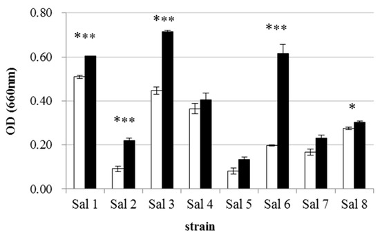 The IAA-degrading abilities of the strains were reflected in their growth differences in the media with and without IAA. The difference was the largest for the most IAA-degrading strain Sal 6, and it was larger in the moderately IAA-degrading strain Sal 3. In contrast, the difference in the other IAA-degrading strain Sal 1 was as same as the least IAA-degrading strain Sal 2 (Figure 2).