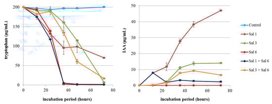 Fate of tryptophan and IAA under co-cultivation of the IAA-producing (Sal 1 and Sal 3) and -degrading (Sal 6) strains of sweet potato endophyte in tryptophan-amended medium. The bars represent the standard deviation (n = 3).