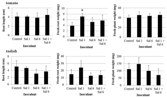 In radish plants, a similar tendency was observed in the fresh root weight, but the difference was not significant due to the large deviations (Figure 4). In addition, the fresh plant weight was improved by the inoculation of IAA-producing strain Sal 1, and the effect was reduced by co-inoculation of the IAA-degrading strain Sal 6 compared to the individual inoculation of Sal 6, although apparent differences were not statistically significant (Figure 4). In terms of root length, the inoculation of Sal 6 showed negative effects, but it was improved by the co-inoculation of Sal 1.