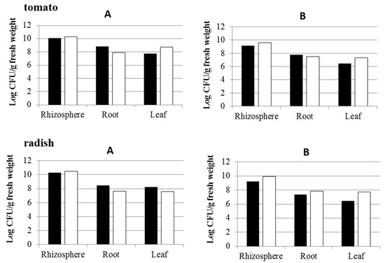 In the individual inoculations, both Klebsiella sp. Sal 1 and Herbaspirillum sp. Sal 6 colonized tomato and radish plants in high populations (Figure 5A). The colonization of the rhizosphere was 2–3 orders higher than the root and leaf in both species. The population of Sal 1 in tomato was 13 times higher in the root than in the leaf, whereas Sal 6 was seven times higher in the leaf than in the root. In the case of radish, the populations in the root and leaf were almost the same for both strains.