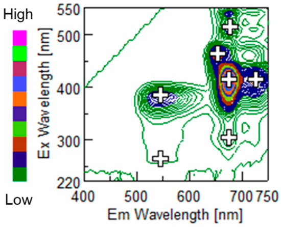 Example of excitation and emission matrix of extracted citrus peel. The brightness of the color is directly proportional to the fluorescence intensity as the color bar represents. The plus marks show fluorescence peaks.