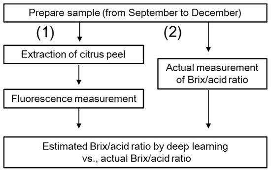 Flowchart of the experiment. (1) Fluorescence measurement; (2) Actual measurement of Brix/acid ratio.