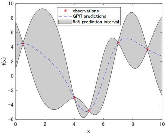 In CNN regression, what we have to optimize is a black box function, which means, when querying at a point x, its expected value and divergence cannot be estimated. Thus, in Bayesian optimization, we assume that the function to be optimized follows a stochastic process. The Gaussian process is commonly used as a stochastic process. For instance, consider that five observations derived from a black box function f(x) are available. Then, the performance of the Gaussian process regression is indicated in Figure 3 [26,27]. In Figure 3, the dotted line illustrates the result of the predictions via a Gaussian process regression. This line represents the estimated value of the function that has the largest possibility. The patched area with grey depicts that with a percentage of 95%, and the value of the function is within the area. Each extracted graph in a vertical direction at a certain x value describes the Gaussian distribution.