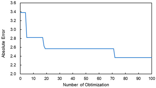 In Bayesian optimization, the best point that contains the higher (or lower) value is estimated; then, a Gaussian process regression is performed including the new observation. By continuing this procedure (in this study, 100 times), optimized parameters are found. The next point to be selected is determined based on the acquisition function that considers both the expected value and variance. When searching around an area where estimation value is highest, it is likely that other high values can be obtained. However, only searching around the area leads to the local maximum, not the global maximum. Therefore, the next point should be selected considering the variance of the estimated value. We define the functions and , which are related to the mean and variance of the objective, respectively; then, using an acquisition function the next point is decided [28]. In this study, the expected improvement was adopted for the acquisition function [29].
