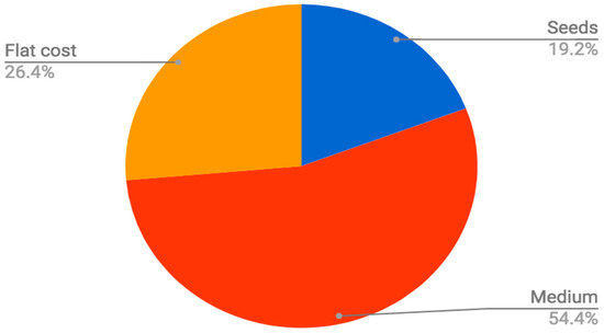 The soilless medium in which seeds are sown is often a large fixed material cost of each crop. When sowing an off-the-shelf EPS flat (generally re-used for 30 successive plantings), with sphagnum peat moss germination mix and spinach seed at a density of 1.5 seeds per cell, the proportional cost of growing medium can be estimated to be over 50% of the total material input costs (Figure 1). Employing a flat with fewer cells, but sowing more seeds in each cell (thus preserving the same canopy density), could meaningfully reduce material expenses. While the density of the canopy would theoretically remain unchanged, it is unclear how packing more seeds into each cell affects germination and growth throughout the short crop cycle. It is hypothesized that seeding more seeds per cell will negatively affect germination and growth as the seed-substrate contact needed for seeds, especially large ones, to imbibe and germinate will be disrupted in cells with multiple seeds by the earliest germinating seeds [8]. One of our objectives was to evaluate this hypothesis.