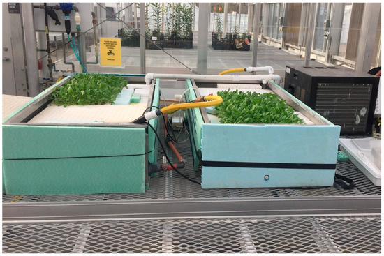 The production period for the spinach plants was conducted using two steel tubs (61 cm by 122 cm by 30.5 cm deep) which allowed five cut flats (described below) to be floated when completely utilized. Nutrient solution (described in Section 2.3) flowed freely between the two channels through a 1.9 cm ID hose. Tubs were insulated with 1.9 cm polystyrene boards on their exterior to minimize heat transfer and reduce cooling load. A 1/6 HP submersible pump was used to pump nutrient water through a venturi injector (for aeration), followed by a ¼ HP inline chiller that kept the water temperature at 19 °C. Water was returned to the tubs through a 2.5 cm ID PVC pipe with outlets into each tub. The nutrient water and root zone were maintained below 20 °C and highly aerated, since this temperature has been to be effective for mitigating spread of Pythium infection, especially P. aphanadermatum, and the high degree of aeration also contributes to greater resistance to infection [12]. Oxygen levels were also enhanced by using two air stones in each tub. Dissolved oxygen saturation was verified using a calibrated YSI Pro20 (Yellow Springs, OH, USA) meter when the system was operating.