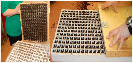 All flats were stacked randomly after they had been seeded, filled, and dibbled. Non-seeded guard flats were placed on the top and bottom of the stack. The entire stack of flats was wrapped in plastic to prevent moisture loss. The stack was moved into a larger, rigid plastic bin for transportation to the germination chamber, where the flats were stored for 60 hours in the dark at 24 °C before removal for inspection and floating.