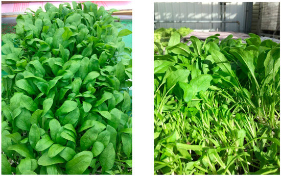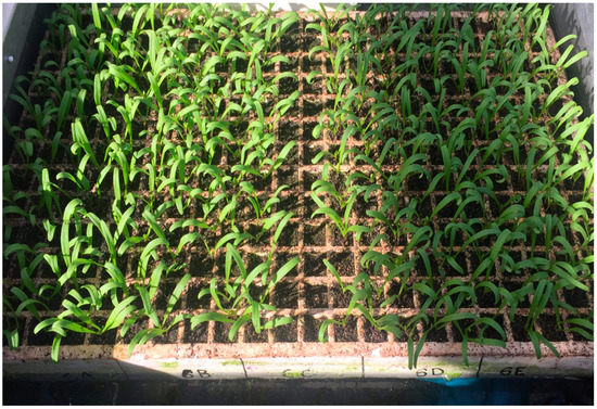 Expanded polystyrene (EPS) flats with varying cell volume and spacing are commonly used for baby leaf production in DWC systems. Typical cell volumes can range from 2 or 3 cm3 to 10 cm3. Cell volume impacted tomato, eggplant, and pepper seedling fresh weight when grown from seed [6]. Planting (canopy) density was less predictive of seedling fresh weight (within the range considered: 94–1125 plants/m2) [6]. Baby romaine lettuce (Lactuca sativa) seeded at higher densities in EPS flats had greater yield per unit area and resulted in plants with longer but fewer leaves compared to lower-density arrangements [7]. This demonstrated that planting density and available cell volume can impact the morphological development of baby leaf crops. However, the effect of proportional cell volume available to spinach seedlings and the higher density of plants in the early stages of growth associated with sowing multiple seeds per cell have not been thoroughly investigated.