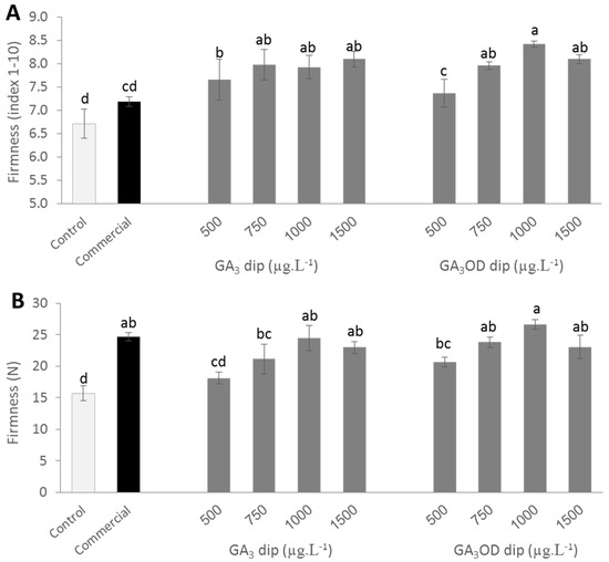 Effect of preharvest spray (commercial) and postharvest dip treatments with gibberellin (GA3), using the formulations GA3 and GA3OD, on firmness index (hand pressure: from 1, soft to 10, firm, (A)) and firmness (Newton, (B)) of persimmon fruit cv. Triumph after 3 months of storage at 0 °C. Average values (± standard error) of six replications with different letters are significantly different at P ≤ 0.05 according to the Tukey–Kramer Multiple Comparison Test.