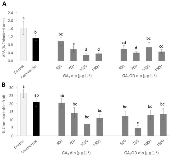 The effect of the GA3OD formulation at a range of 500 to 1500 µg·L−1 was also interesting, showing a reduction in ABS coverage ranging from 56% to 76% compared to the ABS coverage of untreated fruit.