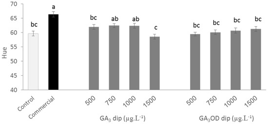 Effect of preharvest spray (commercial) and postharvest dip treatments with gibberellin (GA3), using the formulations GA3 and GA3OD, on fruit color of persimmon fruit cv. Triumph after 3 months of storage at 0 °C. Average values (±standard error) of six replications with different letters are significantly different at P ≤ 0.05 according to the Tukey–Kramer Multiple Comparison Test.