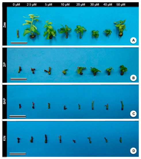 BAP did not show any response at the lowest concentrations of 2.5, 5, 10, and 20 μM. BAP only started showing a low response to 30, 40, and 50 μM (5.0–7.8% shoot formation). BAP was always highly inferior to ZEA at all concentrations tested, in all of the variables analyzed, except for the shoot length at 40 μM. Additionally, BAP was inferior to 2iP from 10–50 μM concerning shoot formation, number of shoots, shoot length, and number of leaves. In the same way, in ‘Bluejay’ and ‘Pink Lemonade’ blueberry, the authors found that BAP induced fewer axillary shoots than ZEA, as well as smaller shoots [27].