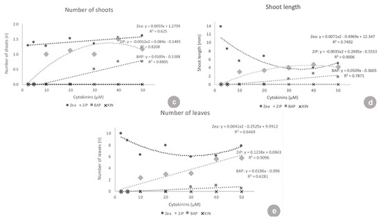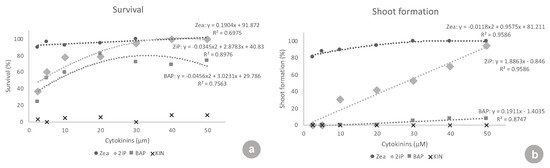 ZEA was superior to the other cytokinins at the concentrations of 2.5 and 5 µM. In all concentrations, KIN had the worst performance for survival rate. Finally, in the concentration range of 10–50 µM, ZEA, 2iP, and BAP all had the same effect on survival. The regression analyses can be observed in Figure 2.
