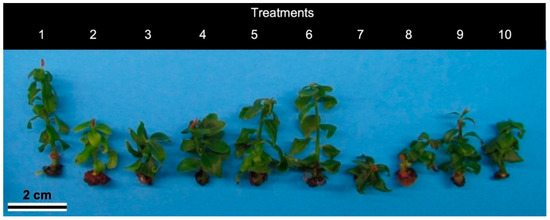 The number of shoots was similar in all the treatments tested. In addition, concerning the number of leaves, the lowest number was obtained with treatments 7 and 8. Observing survival, shoot formation, and shoot length, treatment 1 (original WPM) was superior to treatment 10 (modified WPM) (Figure 3).