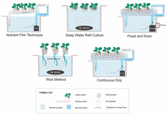Types of hydroponic plant culture systems. “Deep water raft culture” may also be referred to as “float hydroponics” [36], while “flood and drain” can be referred to as “ebb and flow” [39]. The “continuous drip” system is typically called a “drip system” [36], but “continuous” is used here to differentiate it from flood and drain systems that have similar construction, but the pump runs intermittently.