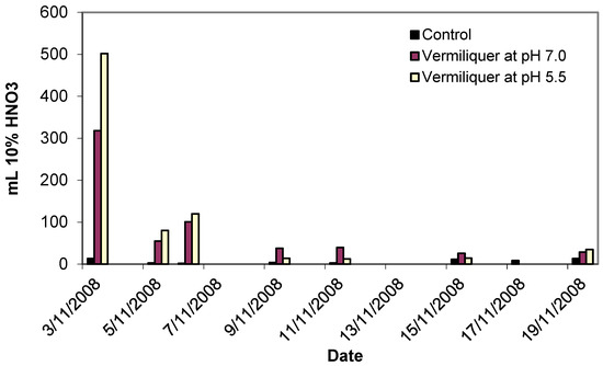 Although different studies were conducted on different vermiliquers at different times of the year and were subject to different ambient temperatures and other environmental factors, only a two-fold range of volume of HNO3 across studies was needed to adjust down a 100 L vermiliquer reservoir to pH 5.5, requiring for example less than 1 L of 10% HNO3 (Figure 1) equivalent to 222 mg/L N. The total amount of 10% nitric acid applied to the control treatment throughout the studies was at least 10 times less, ranging from 3 mL to 58 mL. The stability of pH following the initial addition of acid is considered as one of the major advantages for future use of vermiliquer as a liquid fertiliser in hydroponics. As expected, statistical analysis confirmed strong relationships between the amount of initial buffer added to the nutrient solutions and change in pH (r2 = 0.966, p < 0.01 in Study II).