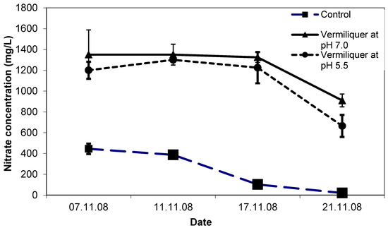 The initial concentration of nitrate was considerably higher in the vermiliquer solutions than the control (ca. 1200 mg/L compared to ca. 400 mg/L—Figure 2). By the end of the study, nitrate in vermiliquer declined to ca. 800 mg/L, whereas in the control it declined steadily with growth to an almost immeasurable quantity (Figure 2). The positive effect of lower pH on leaf chlorophyll (estimated through SPAD measurements) was evident and after one week SPAD values for the control and pH 5.5 treatments were 43.5–44.0 compared to 40.5 for the pH 7.0 treatment (LSD p < 0.05 = 2.0) despite the pH 7.0 treatment having higher nitrate concentration than in the control (Figure 2).