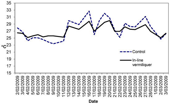 Figure 3 illustrates the solution temperatures in this study. The dampened range of daily temperature in the in-line vermiliquer may have been due to the greater heat sink capacity in that treatment compared to the control (380 L versus ca. 100 L in the control).